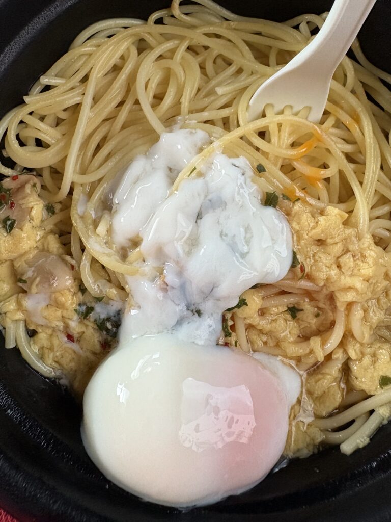 ニンニク風味のピリ辛オイルソースと卵と麺が絡まり合って